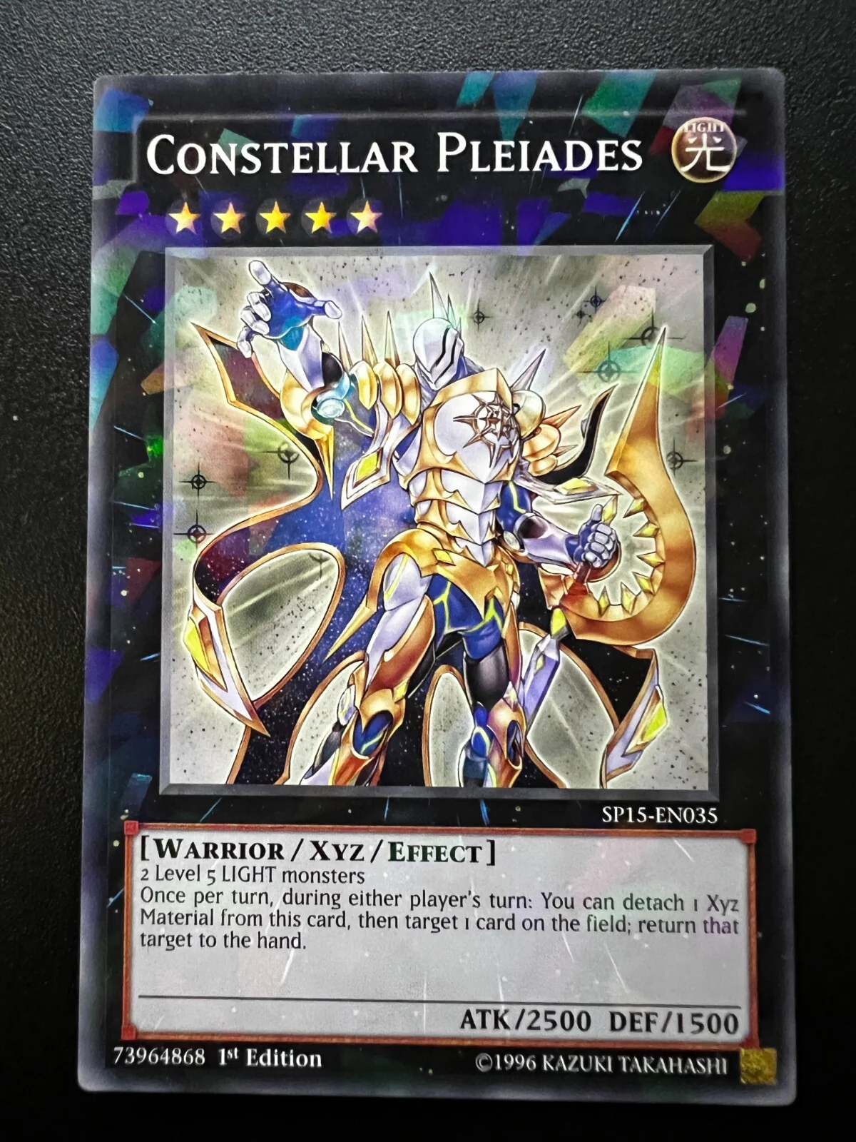 What it looks like: The artwork is holographic and shimmers when tilted, but the card name is printed in plain non-foil text (black or white depending on card type). On newer prints the Level/Rank stars and Attribute icon also shimmer.